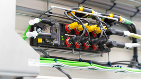 e-Carts from Krups Fördersysteme optimize the assembly and testing track in the battery pack production of a German car manufacturer; Turck's IP67 PLCs provide the decentralized operation control