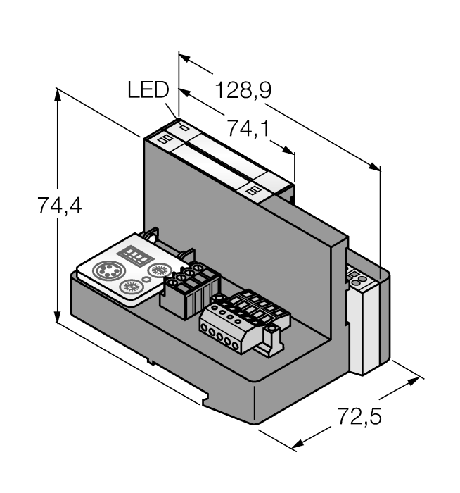 - LEDs for display of supply voltage, group and bus errors as well as status and diagnostics