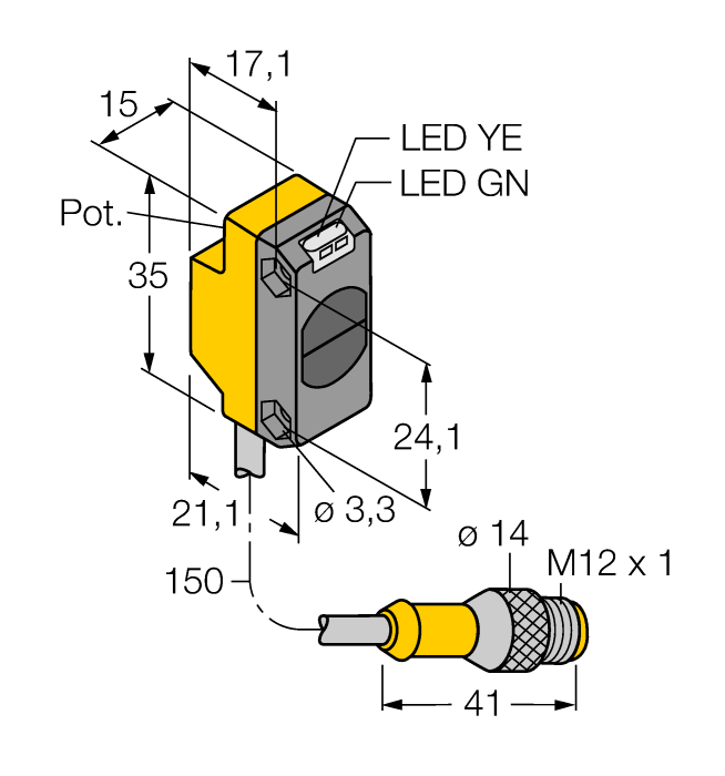 - Cable with male end, M12 × 1, 4-pin, PVC, 150 mm